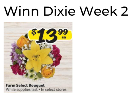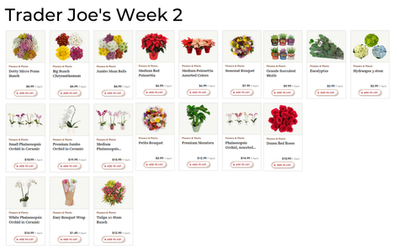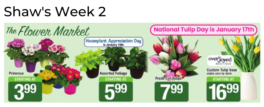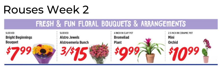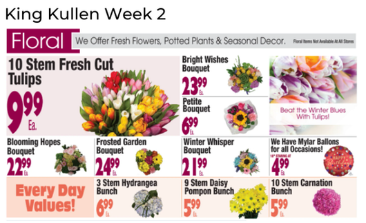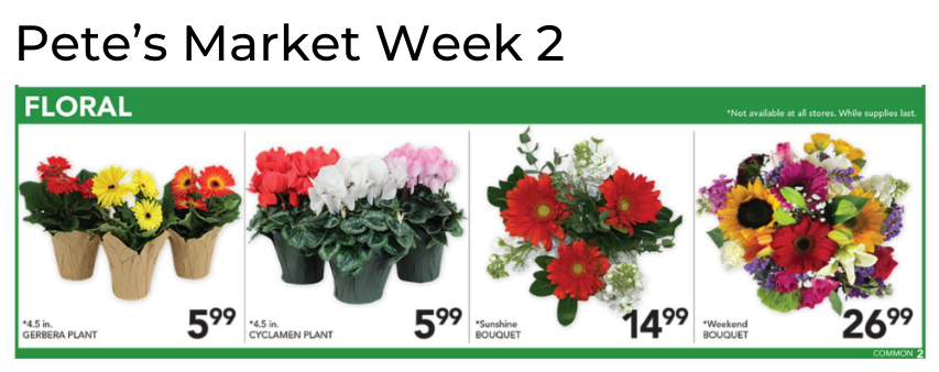 No floral ad this week from Aldi, Cub Foods, Fresh Market, Giant Eagle, Giant Food, HEB, Lowes, Meijer, Schnucks, Stater Bros, Stop & Shop and Tony's Fresh Market.