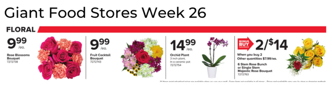 No floral ad this week from Aldi, Central Market, Cub Foods, The Fresh Market, Giant Eagle, HEB, Lowes, Meijer, Schnucks, Target and Tony's Fresh Market.