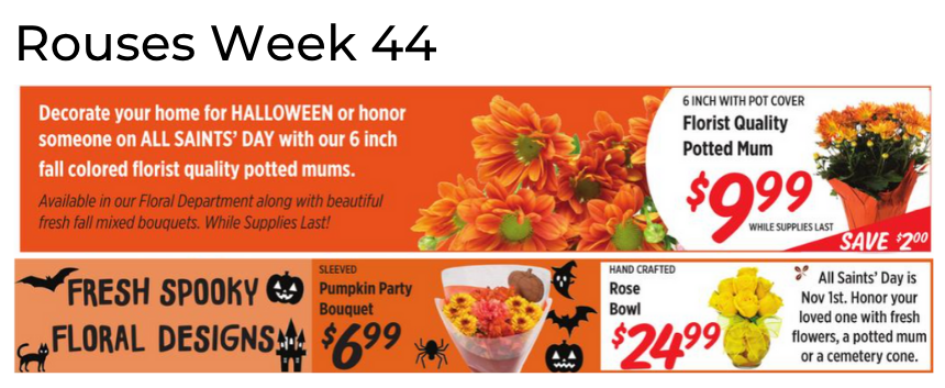 No floral ad this week from Aldi, Central Market, Cub Foods, The Fresh Market, Giant Eagle, Giant Food, HEB, Longo's, Lowes, Meijer, Publix, Schnucks, and Stop & Shop.