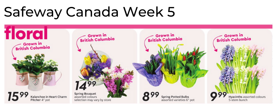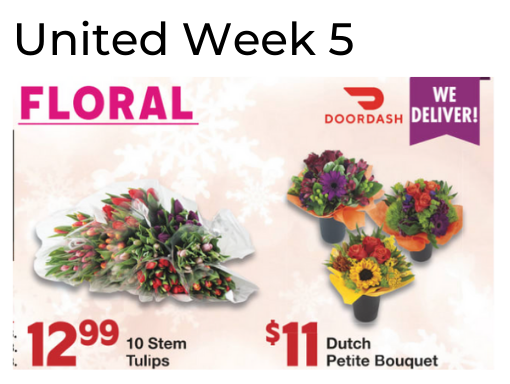 No floral ads this week from Cub Foods, The Fresh Market, Giant Eagle, Harris Teeter, HEB, HyVee, Loblaw's, Longo's, Meijer, Schnucks, Stater Bros, and Stop & Shop.
